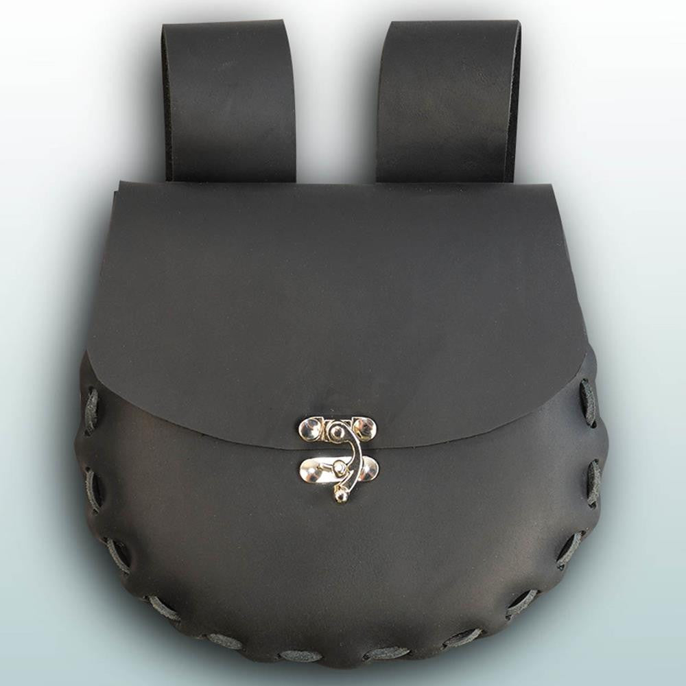 This medium sized round Medieval pouch is hand sewn from soft, supple leather with an antique brass latch for closure. Two sturdy 2" wide belt straps secure it to any belt width up to 6". A very classic look that will compliment your medieval or Renaissance outfit and securely hold your keys, credit cards or money, cell phone and anything else that you carry to the faire. Available on black or brown.