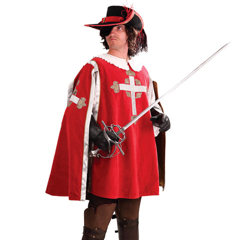The elite guard of the infamous Cardinal Richelieu wore this tabard as a sign of his office. This blood red tabard is made of heavy red cotton velvet with an antique gold rayon lining. Embroidered crosses with fleur-de-lis are on chest and sleeves. The tabard looks great with the  Musketeer Shirt. One size fits most. Note: Dry clean only.