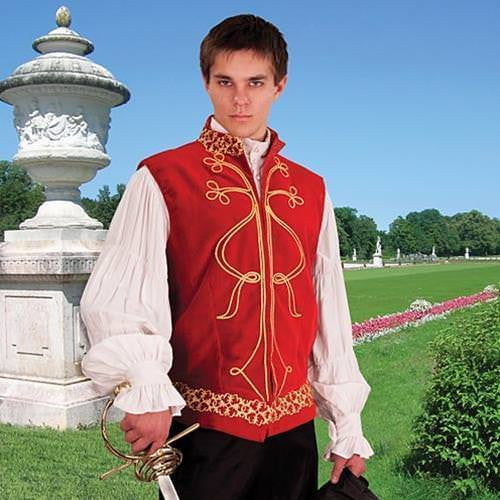 This lush courtly vest is made of rich, cotton velvet. Elaborate hand sewn gold brocade work adorns the front, while matching gold trim lines the collar and waist. Heavy-duty hook & eye closures secure the front. Fully lined. Dry clean only.