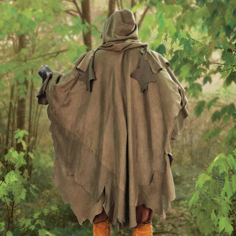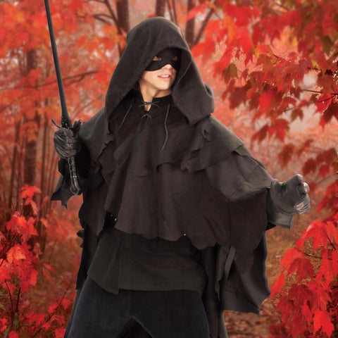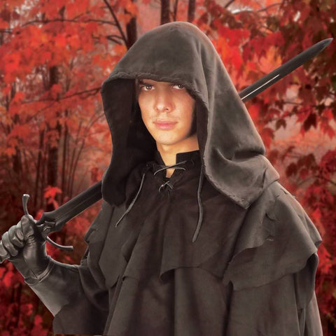 Rangers are characters with mystery and intrigue about them. They tend to be wise, cunning, stealthy, and masters of tracking. This Ranger's Fantasy Layered Hooded Poncho is crafted of a shredded, soft ultra-suede polyester and brings about that  enigmatic look. A full-size hood is attached to the poncho which exhibits a lace-up neckline and underarm elastic to keep it in place during the heat of battle. The tattered, dark appearance makes this piece an ideal Medieval or Renaissance costume apparel for both men and women.