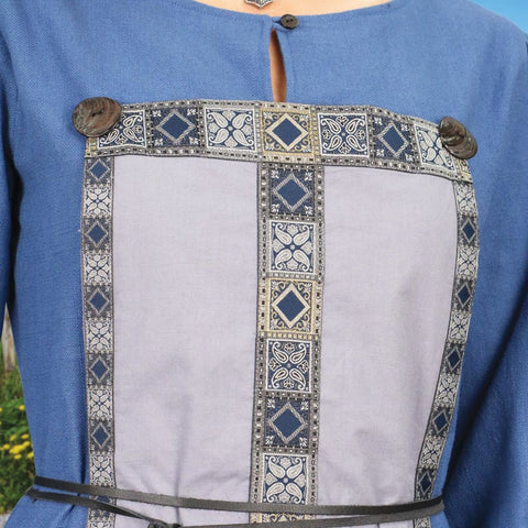 This traditional  women's Viking dress is  a real eye-catcher. Made of a  lightweight, dusty blue cotton  twill fabric, it has a lace-up  back with matching blue ribbon  and wooden buttons at the wrists  and neckline. The soft grey  placard in the front has a Viking  trim around the edges and center.  Two hand-carved wooded buttons  decorate the front. Comes with a  leather cord for belt.