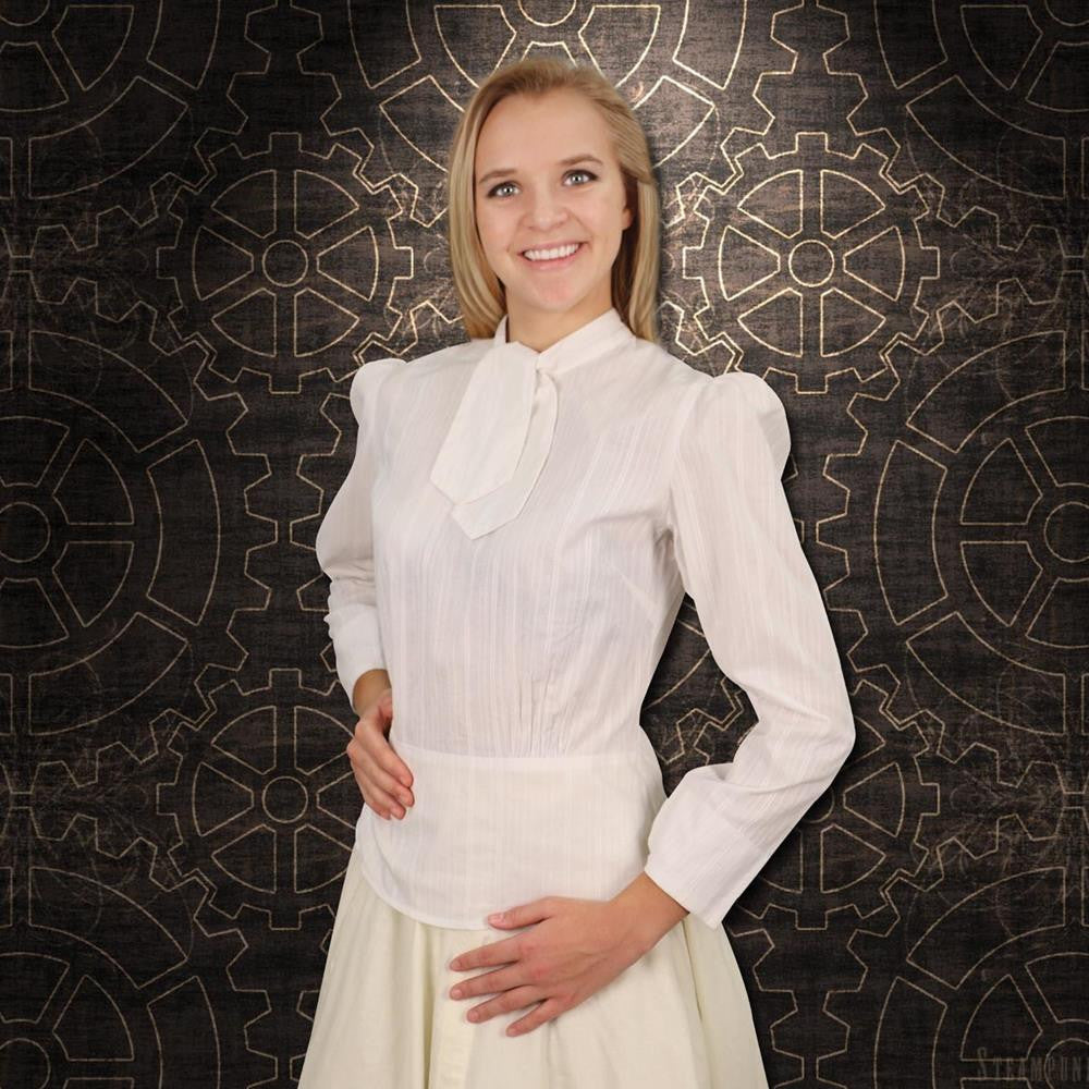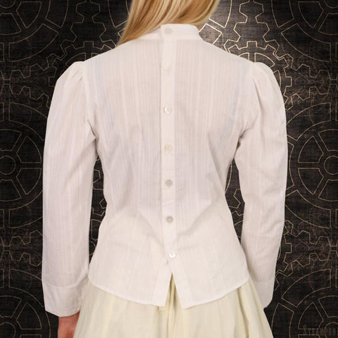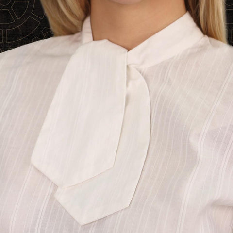 This white-on-white, raised stripe, 100% cotton women's Safari Blouse is a wonderful addition for period ensembles. The front collar has an attached ascot scarf which can be tied or a jeweled brooch added for a more dignified look. The straight sleeve ends with a tapered button and looped cuff. The bodice of the shirt ends in a peplum bottom, allowing for a clean tucked-in look or a loose outside look. The blouse exhibits a full, button-down back with seven Mother of Pearl buttons.