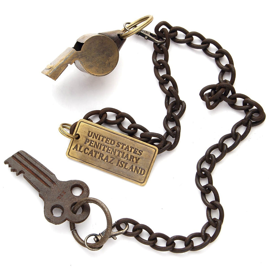 This is a hand aged, reproduction Alcatraz Guard Key and Whistle in solid brass and iron. Standard issue to guards during this penitentiary's heyday, it includes a solid brass, functional whistle, iron key with chain and a brass tag which reads UNITED STATES PENITENTIARY ALCATRAZ ISLAND. An amazing collectible and conversation piece.
