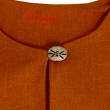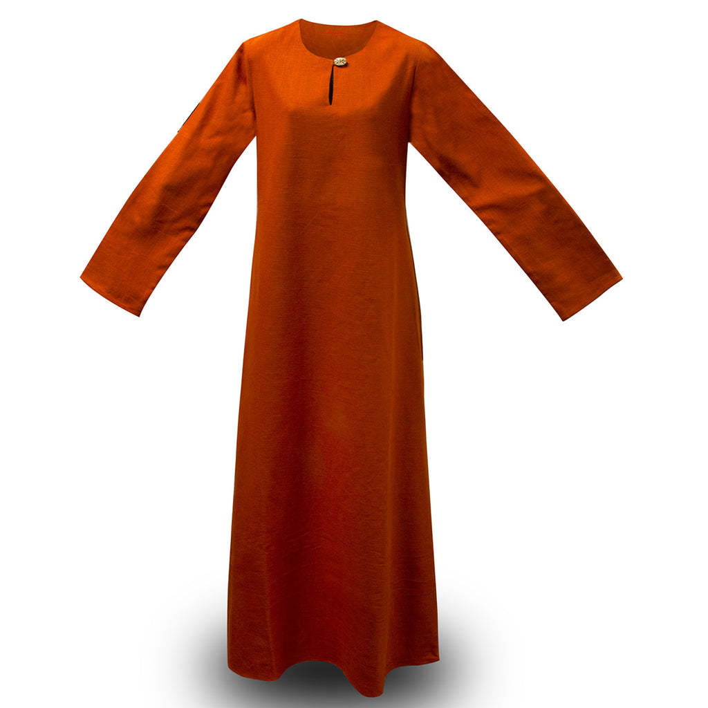 Worn by women in the Viking age, dresses like this continue to be worn to celebrate Nordic traditions. Made in a soft, 100% cotton with a linen weave, this terracotta-colored dress has a full bottom and ankle-length skirt. It fits loosely enough for flexibility but still allows an apron or overdress to be worn over it. The inside collar is hemmed and the front closes with a single bone button. Finish the look with the Astrid Apron. Available in sizes S, M, L, XL, or 2XL.