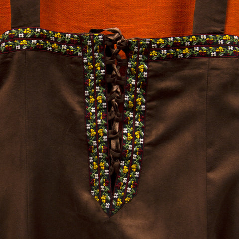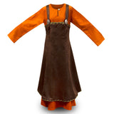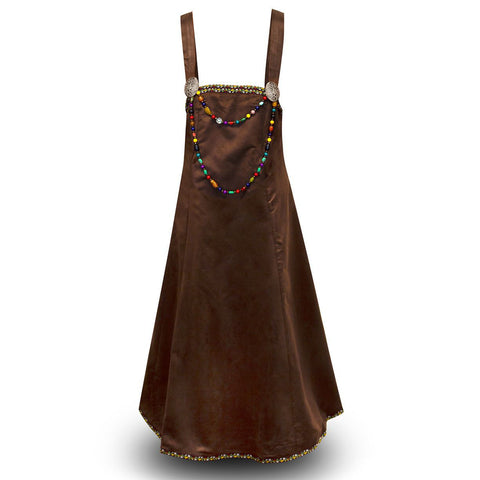 Wear this over our Astrid underdress, or any other plain dress. Add a belt and pouch to complete a Norse woman or shield maiden look. Available in sizes S, M, L, XL, or 2XL. The apron is 100% polyester dark brown micro suede.