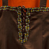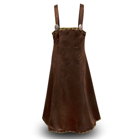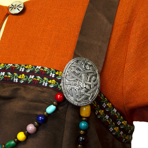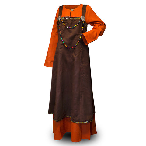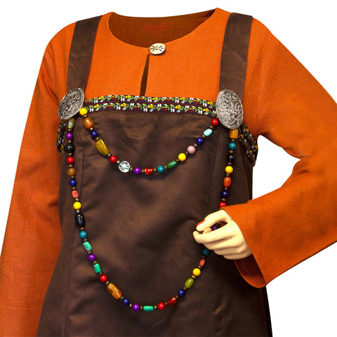 Apron dresses were a staple of Viking attire. These overdresses had shoulder straps, a simple tubular shape, and ended mid-calf. Also known as smokkr or hangerok (sometimes spelled hangeroc or hangerock), the original purpose was not only to protect the dress from getting dirty but to also make the wearer look more stylish and elegant. Our Astrid Overdress is of a more elaborate style. It is trimmed with embroidery work at the top, hem, and along the lace back. Two silver-colored brooches hold the straps in place at the front. You can also use your own brooches or sew the straps in place to the desired length. A long strand of beads is included to hang between the brooches. It can easily be removed when cleaning the apron and allows you to add your own decoration as well.