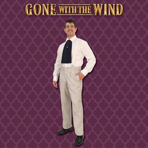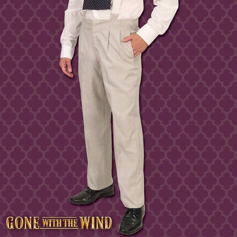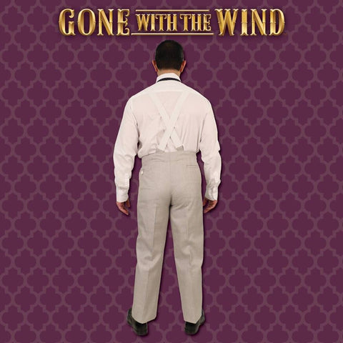 Only few left in stock - order soon!The first time Scarlett O 'Hara sees the dashing Rhett Butler in the film, he is wearing this stunning gentleman 's ensemble.These smart looking, pearl grey pants are made of suit-weight poly cotton with a double pleated front with zipper and two hidden, deep side, seam-slit pockets. They also have two rear pockets, one with a button closure, and come with a pair of 1-1/2" wide, white suspenders which button to the pants.