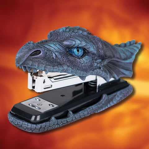 This blue dragon stapler is one of the cutest conversation pieces ever offered for your home office. This full functional stapler has been decorated with a resin dragon head and bottom jaw, ready to puncture your paper! These pieces have been hand finished giving you the look and feel of a truly fierce blue dragon! Uses standard size metal staples, not included. Green dragon stapler also available.