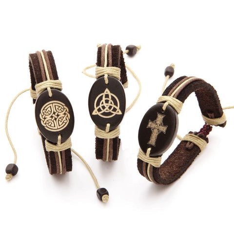 Closeout!This set of 3 bracelets are hand made from genuine leather, twine and wood with laser etched Celtic designs. Adjustable to fit most wrists, these look and feel better the more you wear them.