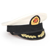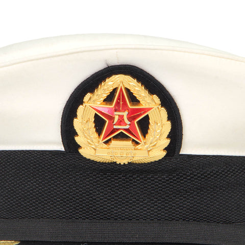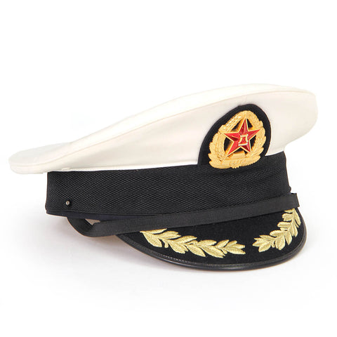 Although in excellent condition, these genuine surplus Chinese Naval Visors may show signs of storage. Type 07 PLA Officer 's visor cap with badge. Pinned to the front of the visor is a metal badge with the traditional red star with a gold wreath. Sitting below the emblem is a black chinstrap that is connected to the visor with two gold chinstrap buttons that are embossed with the CCP star. Please specify medium, large or extra large size.