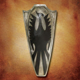 This massive Death Dealer Shield shows the battle scars of many campaigns. It is an incredible addition to the Frank Frazetta Signature Edition line. Made from hand formed steel by the master smiths at Windlass Steelcrafts, it is accurately curved by to accommodate the Death Dealers muscled arm. Antique finish with adjustable leather straps in the back and gripping handle.