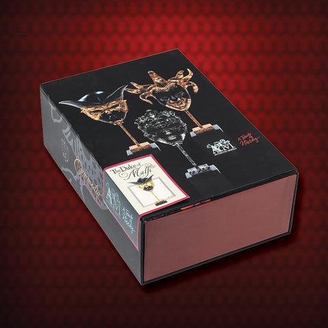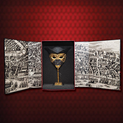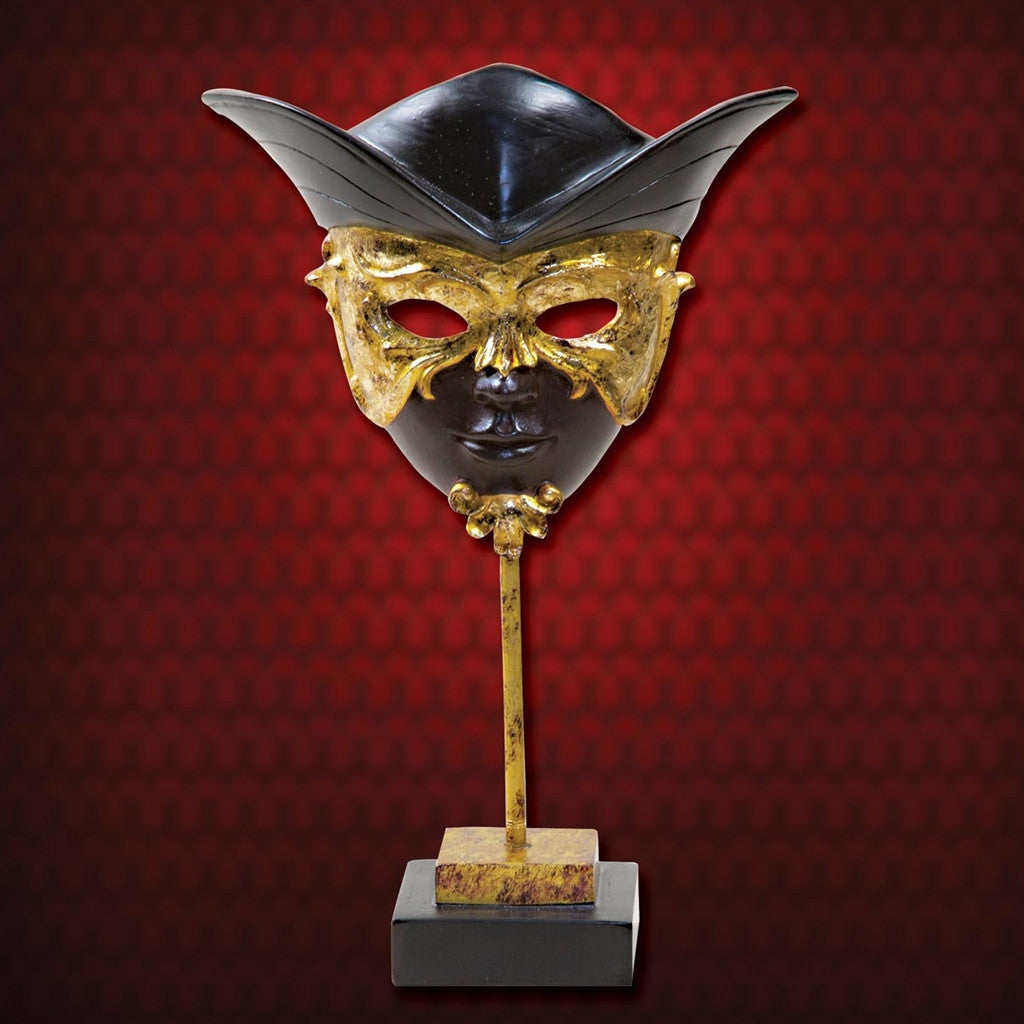 Though somewhat smaller than full size, this miniature Duke of Malfi Venetian Mask is quite attractive and impressive. Made of resin with a faux marble and wooden base and hand-painted to full festival splendor. Packaged in a gorgeous display gift box, complete with its story and 17th Century map of Venice printed on the inside.Coordinating Duchess of Malfi also available.