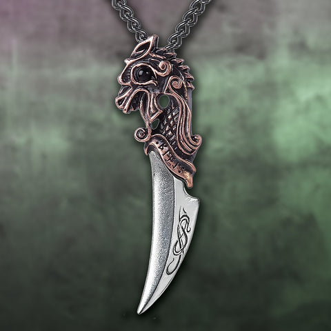 This stunning Viking talisman was used for personal protection and symbol of self-preservation. Its name come from the Norse word Einar, One who fights alone, and Dolk, dagger. Made in England of fine pewter and has a black cabochon in the dragon 's eye.