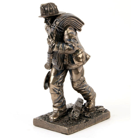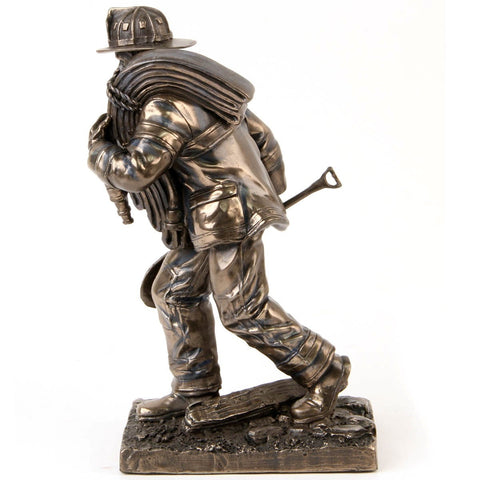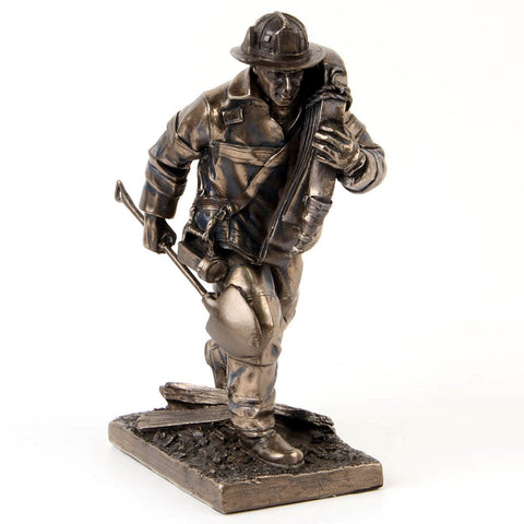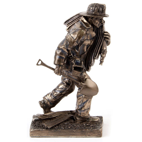 Some of our heroes fight the fires we can't. This cold cast resin firefighter statue has an antique bronze finish for the look and feel of metal. Brave and resolute, he heads into action.