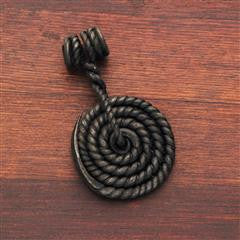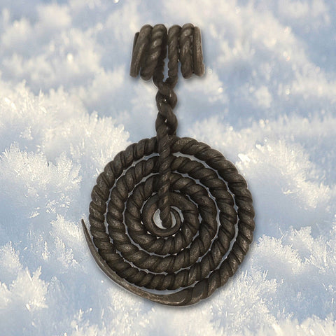 This Medieval style small pendant has been forged into a concentric wheel using a twisted piece of steel. Black finish, it measures 2" in diameter and 2-1/2" high.
