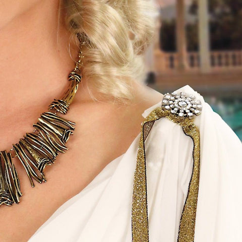 This lovely flowing gown harkens back to an age of Gods and Goddesses. The soft double layered white gown has a lace-up back and delicate gold trim around the waist and sleeves.