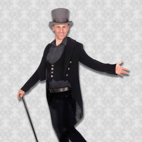 This ensemble will transport you to the Paris Opera House or just a lovely night out along the Avenue des Champs-Élysées. This matching set consists of a lined, open velvet tailcoat with six silver buttons and a short, formal vest with four matching silver buttons. Available in sizes M, L, XL, or XXL.