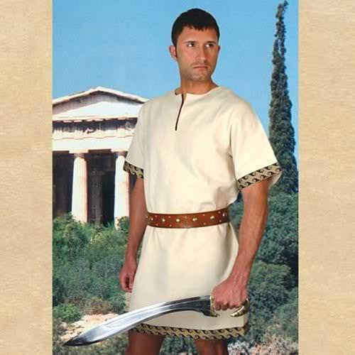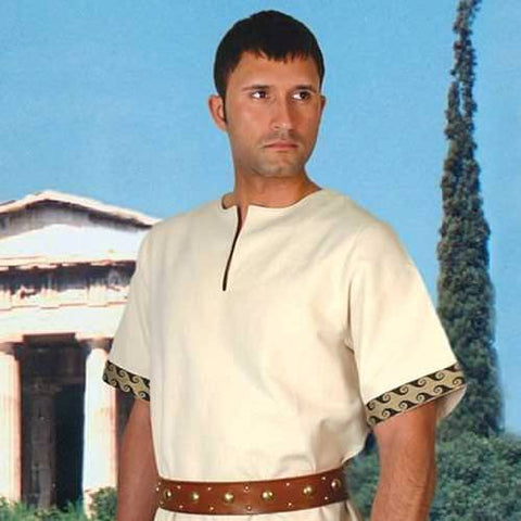 This short cut tunic is perfect for either the market streets or under any Greek armor. The sleeves and bottom are accented with a Greek trim which emulates the waves of the Aegean.