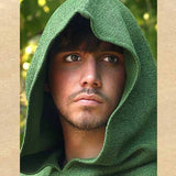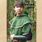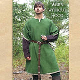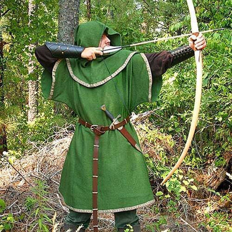 The Lord of Huntingdon Over Tunic can be worn alone or with any under garment.  The “archer 's" sleeves fall freely open when your arm is raised, while the full hood allows for perfect anonymity. Both tunic and hood are edged with a brown medieval trim.