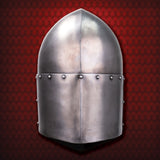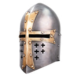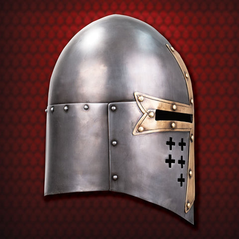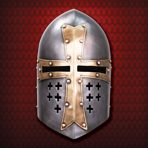 The sugarloaf style of helm was the forerunner of what would become the great helm and eventually gave way to the lighter weight bascinet style. Our version is one that would have been found at the later part of the 13th  century and the very beginning of the 14th  century.Its conical top deflects the glancing blows of a sword, while the antique decorative brass cross on the face sports the cross of the Knights Templar. Made of 18 gauge steel, the helm has a soft, padded adjustable liner inside, which allows for a perfect fit.  Made by Windlass Steelcrafts.
