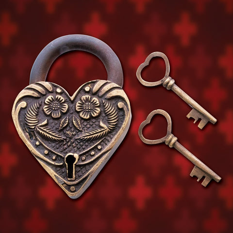 This is the largest version of this romantic heart lock we have ever offered. Measuring a full 4-1/4" x 3" this brass and iron heart-shaped padlock is full of antique floral detail. Fully working with two brass keys.