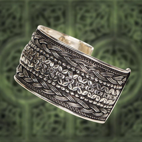 This beautiful silver finish cuff bracelet is accented with braids and stylized flowers.
