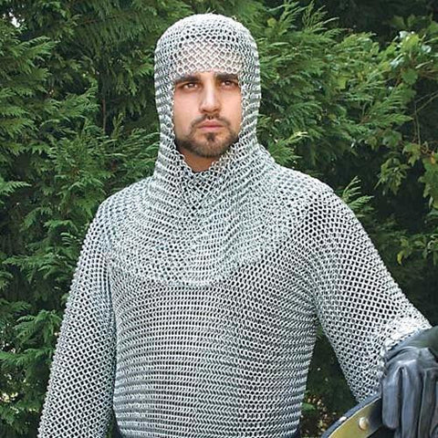 Mail shirts fit up to a 54” chest with a 33” long shirt. The sleeves are approximately 18” and hang to just below the elbows on average height warriors. This mail shirt is made of butted 16 gauge steel links in the International Pattern, 4 links through a 5th, a style common to all European mail. The outer link diameter of each link is about 7/16" with the inner link diameter at about 3/8". We recommend keeping this mail oiled at all times. Made by Windlass Steelcrafts. Great for a wide variety of outfits from Viking and Medieval to early Renaissance.Express delivery not available on mail. Mail Shirts add $6 each additional s/h.