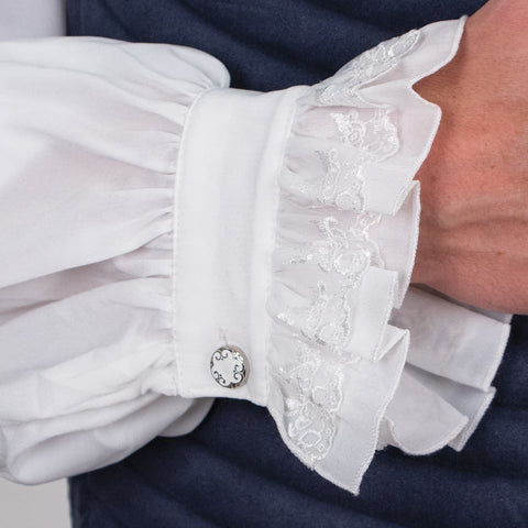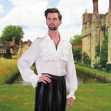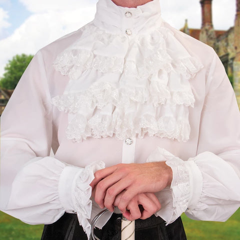 Whether you are planning for your next Pirate adventure or attending a royal court, this exquisite high collar shirt is the perfect outfit for you. Made of 100% polyester, the shirt features three rows of ruffles down the front with matching ruffles at the sleeve. White and silver enameled metal buttons grace the front and the cuffs. Available in S, M, L, XL.