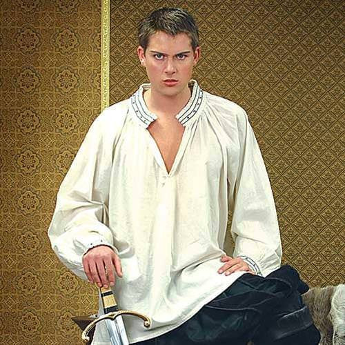 This generous period shirt features an embroidered cross pattern on the collar with a hook & eye closure. Made of 100% cotton. Natural White!