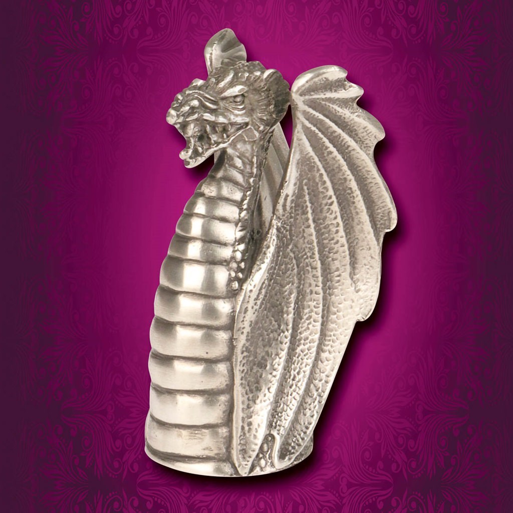 This Pewter Dragon Shot Glass is a wonderful novelty item for your castle: it is decorative when empty and practical when used! Right side up this is a detailed pewter dragon sculpture, but when flipped upside down, it is the perfect shot glass with dragon wings for comfortable finger holds!