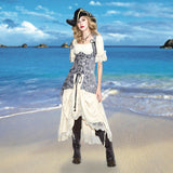 You can now look like you are the favorite damsel of the Pirate King when you wear this glorious long corset. Made of a truly rich polyester grey-on-grey brocade fabric with large grey velveteen sleeve cuffs. The garment has a matching polyester satin lining with a pointed, ducktail back. The lace-up shoulders and front allow for a unique fitted look for just about any shape. The most versatile feature is that the sleeves can be unzipped for a totally different look, giving this piece a lighter more summer feel. This piece truly looks amazing when coupled with our Pirate Mistress Chemise #101819. Available in sizes S, M, L, and XL.