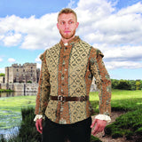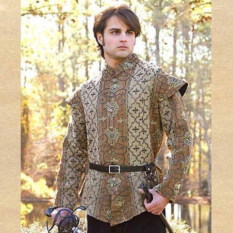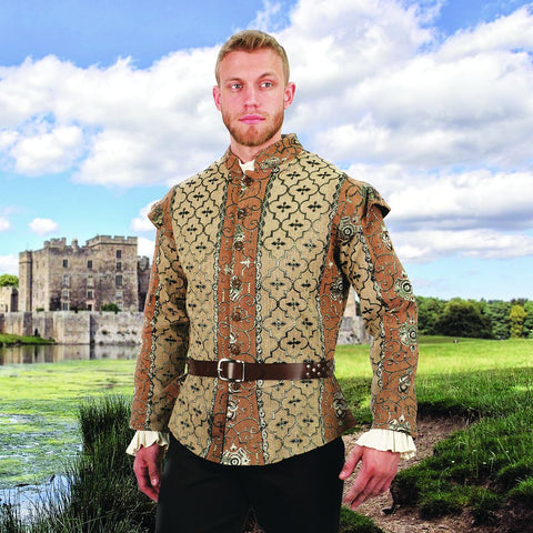 The elegance of the Renaissance lives on in this magnificent men's doublet. Manufactured of a heavy brocade fabric and sporting a row of antiqued buttons, every effort has been made to ensure the finest care in the alignment of the fabrics to give this jacket a truly royal appearance.