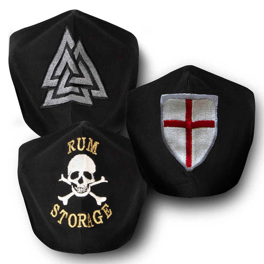 In this set of 3 face masks you will get our Viking Valknut, Crusader Shield, and Rum Storage masks. They are lightweight, breathable, and stylishly designed with everyday work in mind. Made of 100% cotton with silk thread embroidery, they are multi-layered and have a sleeve so you can slide an additional disposable filter into the pocket if desired. The one size fits all construction, combined with adjustable elastic straps behind each ear, provides a snug fit. It even fits well over beards! Machine washable.
