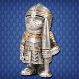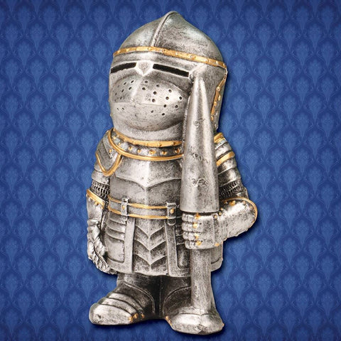 The  bascinet was a medieval military helmet (also called Hounskull or Pig-faced Helmet) with pointy features, which ably protected the head and neck during battle. This cute little knight ably models the helmet. The statue is crafted of a tough resin and then hand-painted to look like metal. It is a great addition to any collection and will make a terrific conversation piece.