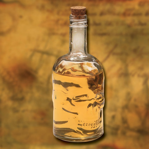 What a great bottle for your bar or pirate ship! This lead free glass bottle comes with a skeletal face in relief on both sides. Comes with cork stopper. Hand Wash Only.