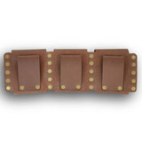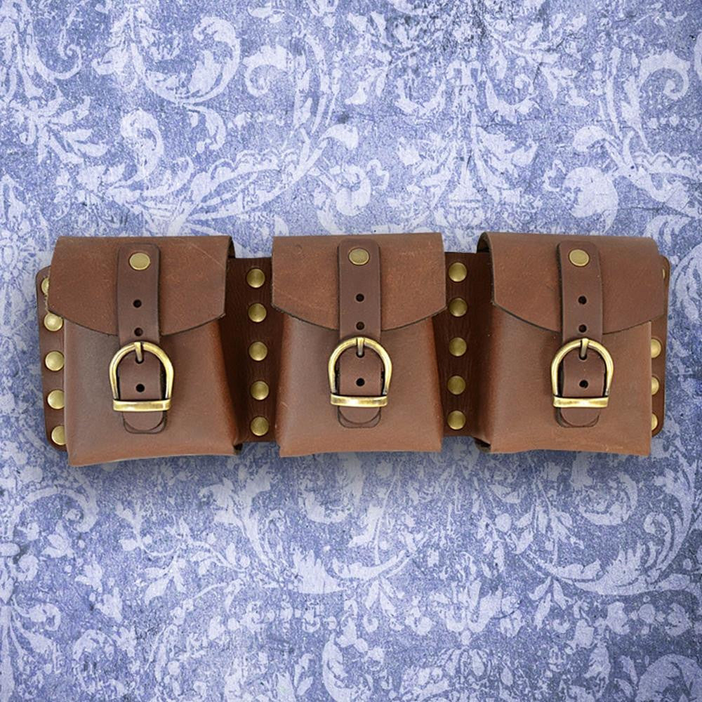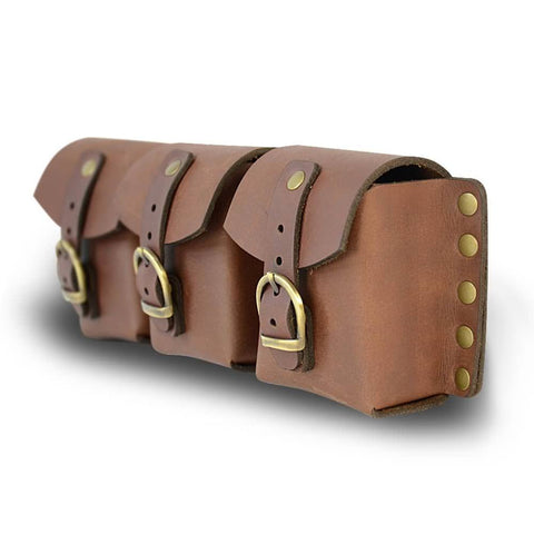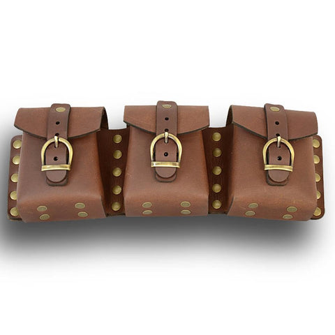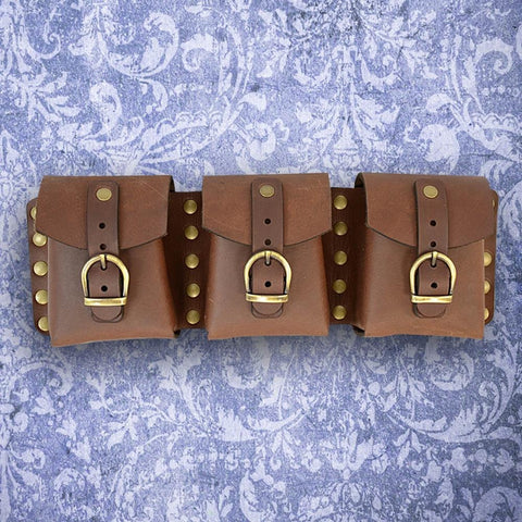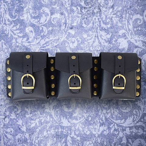 This Steampunk Utility Belt Pouch offers three handy compartments. Crafted from high quality leather with antique brass adornments, this belt pouch will compartmentalize your trinkets and keep them separated. Each pouch offers a buckle closure and is backed by a belt loop. Fits belts 2"-2-1/2" wide. Available in black or brown.