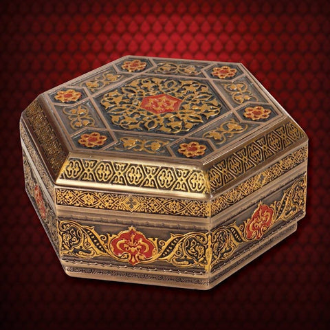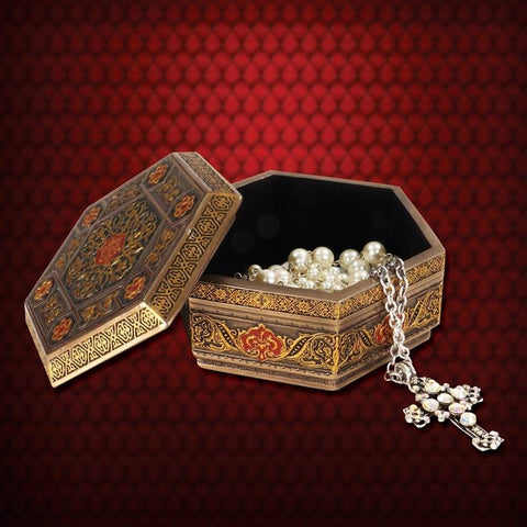 This beautiful hexagonal trinket box makes a fine addition to just about any room. Made of a cold-cast resin, it is exquisitely painted in deep burgundy with golden filigree work.