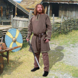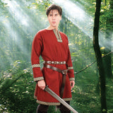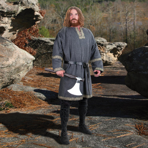 These 100% wool Viking tunics are made with rich fabric which is heavy and accurate to the period. The sleeves, collar and hem are accented with a thick Nordic design trim. An authentic addition to your Viking wardrobe. Dry clean only, available in brown,crimson  or grey.