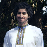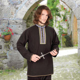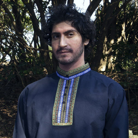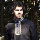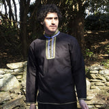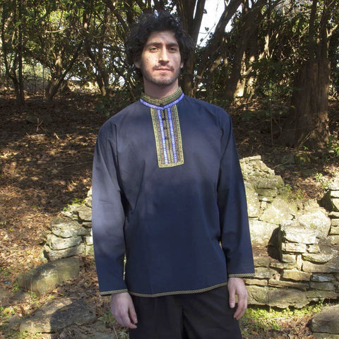 This design has been in use for hundreds of years in many different countries. Our lightweight cotton shirt has a four-button opening at the neck and embroidered folk-style trim at the collar and placket. Smaller matching trim decorates the cuffs and hem. Perfect for events and even everyday wear. Available in Natural, Dark Blue, and Black.