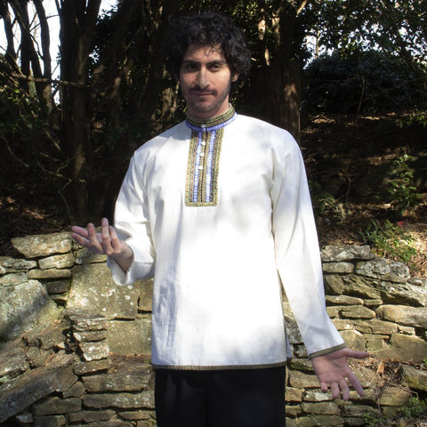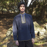 This design has been in use for hundreds of years in many different countries. Our lightweight cotton shirt has a four-button opening at the neck and a 1-1/2" embroidered folk-style trim sewn around the collar and placket. Smaller matching trim decorates the cuffs and hem. The collar can be worn open or closed. Perfect for events and even everyday wear. Available in Natural, Dark Blue, and Black in sizes S, M, L, or XL.